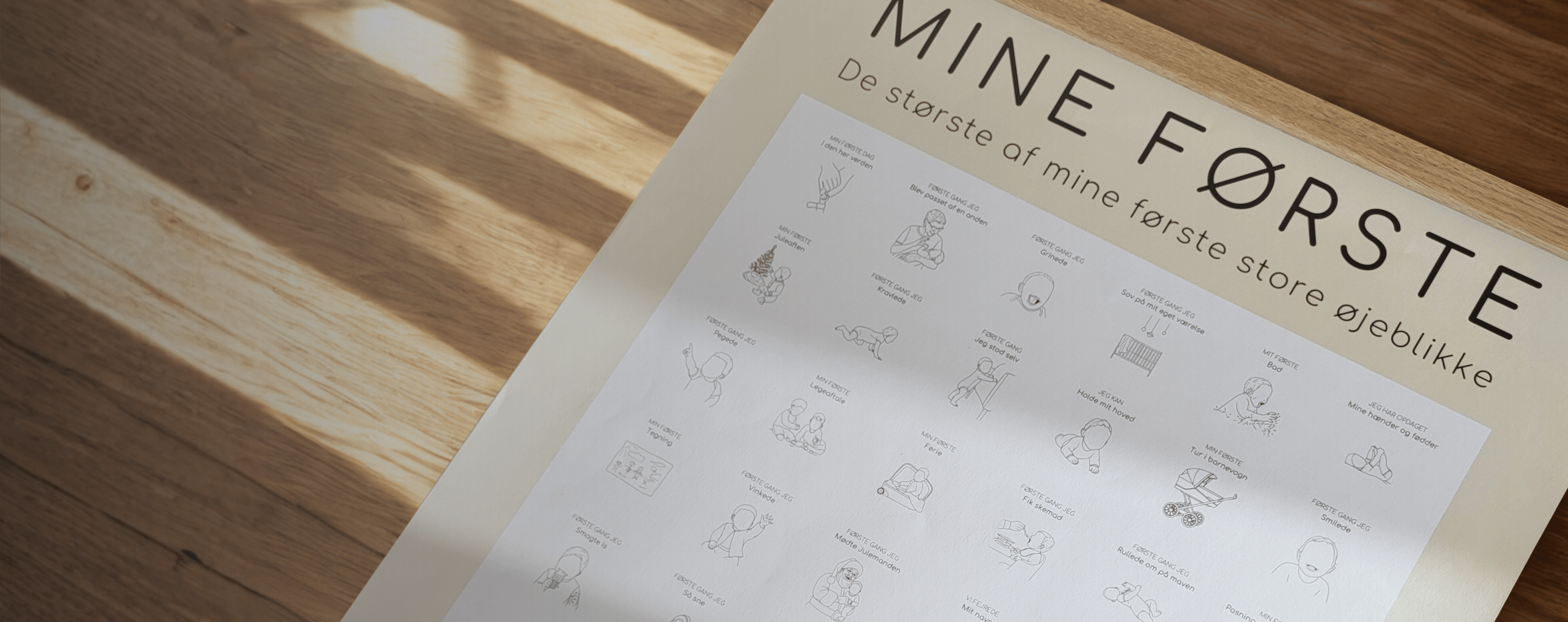De første år flyver afsted, og midt i hverdagen kan de magiske øjeblikke hurtigt drukne. Mine Første samler 48 af barndommens største milepæle – fra første grin til første skridt – og gør dem til en synlig del af hjemmet. Sæt et stempel, og lad plakaten vokse i takt med dit barn. Et smukt og moderne alternativ til milepælskort og scrapbøger – skabt til at blive set, ikke gemt væk.